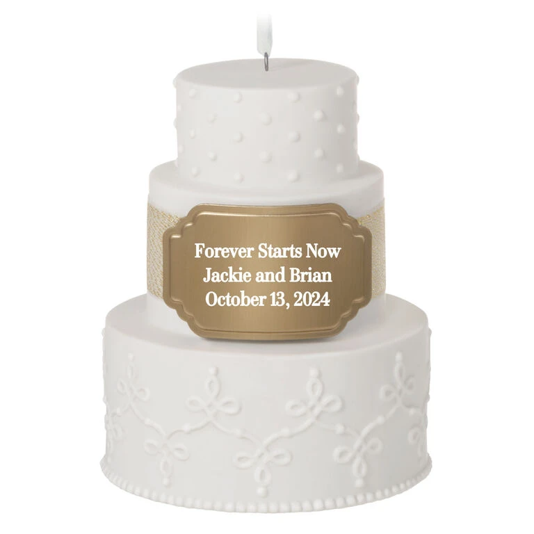 Add a special touch to your first holiday season together with this personalized Christmas tree ornament. The pretty ceramic three-tier wedding cake design features a metal accent to customize with a name, date or personal message. Makes a heartfelt bridal shower or wedding gift for newlyweds.